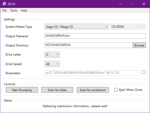 In this case, the DICUI version (1.16-307 as of now) I have tried, which is tied to my first issue I submitted wherein the EXE dates were not noted, cannot be found, because every time I dump a disc, it just sits at "gathering submission information... please wait!" and does nothing for the submission information.