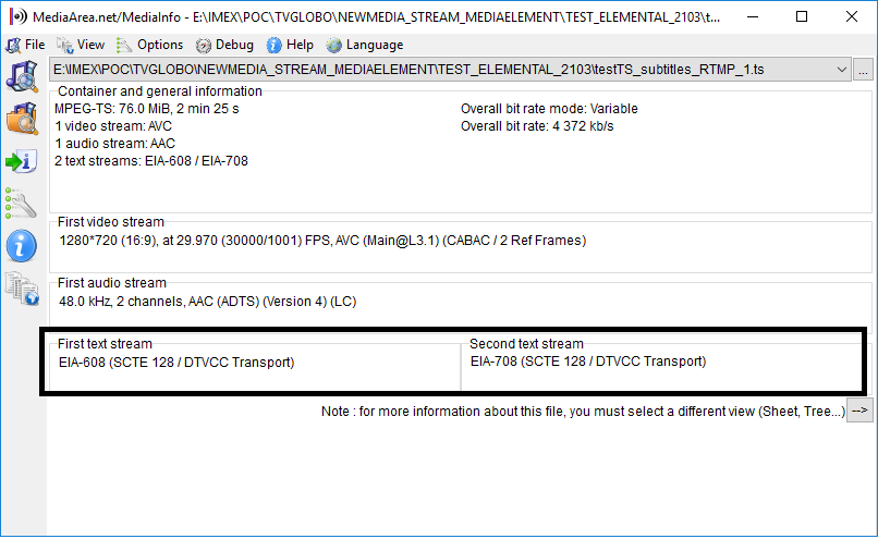 Please find attached the video file with MPEG-TS format to take a look at your side and screen shoots with media information and VLC showing the subtitle tracks with closed caption 1: