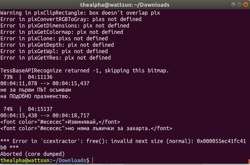 -quant 0 -nofc -in=ts -datapid 0x1de7 -out=srt -stdout -nobom -trim -noteletext -codec dvbsub -dvblang bul -ocrlang bul cinemax.tsI'm using tesseract version
