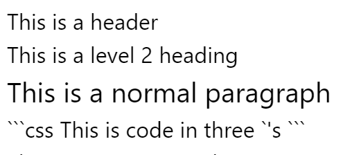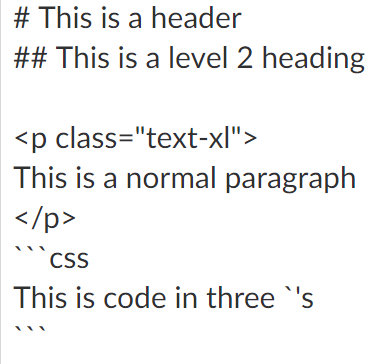 </p>and```csshttps://babelmark.github.io/?text=%23+This+is+a+header%0A%23%23+This+is+a+level+2+heading%0A%0A%3Cp+class%3D%22text-xl%22%3E%0AThis+is+a+normal+paragraph%0A%3C%2Fp%3E%0A%0A%60%60%60css%0AThis+is+code+in+three+%60%27s%0A%60%60%60
