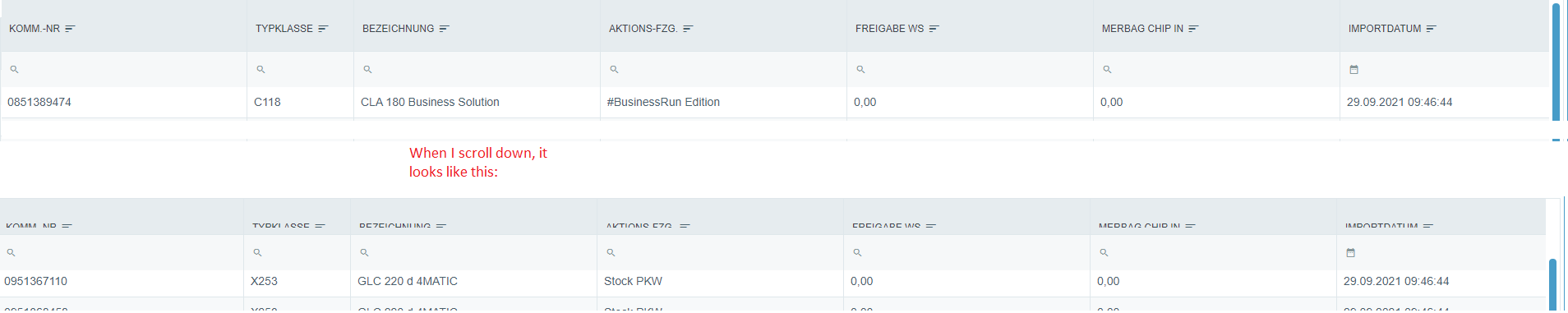 So there is this problem with the DataGrid where, when scrolling down, the column with the search tools moves over the header of the table and hides the headlines. If I remove the search bar, then everything works fine. The search bar just does not stay in place.
