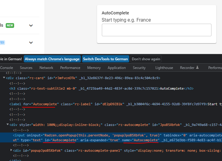Im using this components with RadzenLabel and "Component"-attribute as "for"-attribute. The controls couldnt match with the labels "for"-attribute.