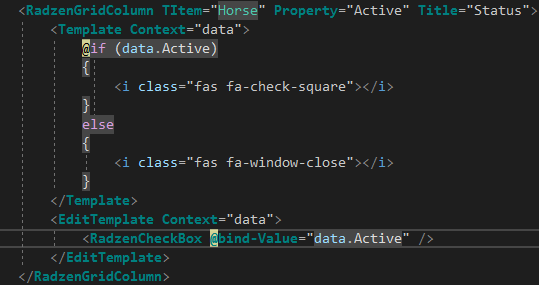 When using the RadzenGrid in-line edit functionality, if you use any sort of Checkbox control, the edit mode gets switched off as soon as the value is changed, but the changes don't save. In order to save it, you have to re-enable edit mode for the row, then save changes to push them up to the server.