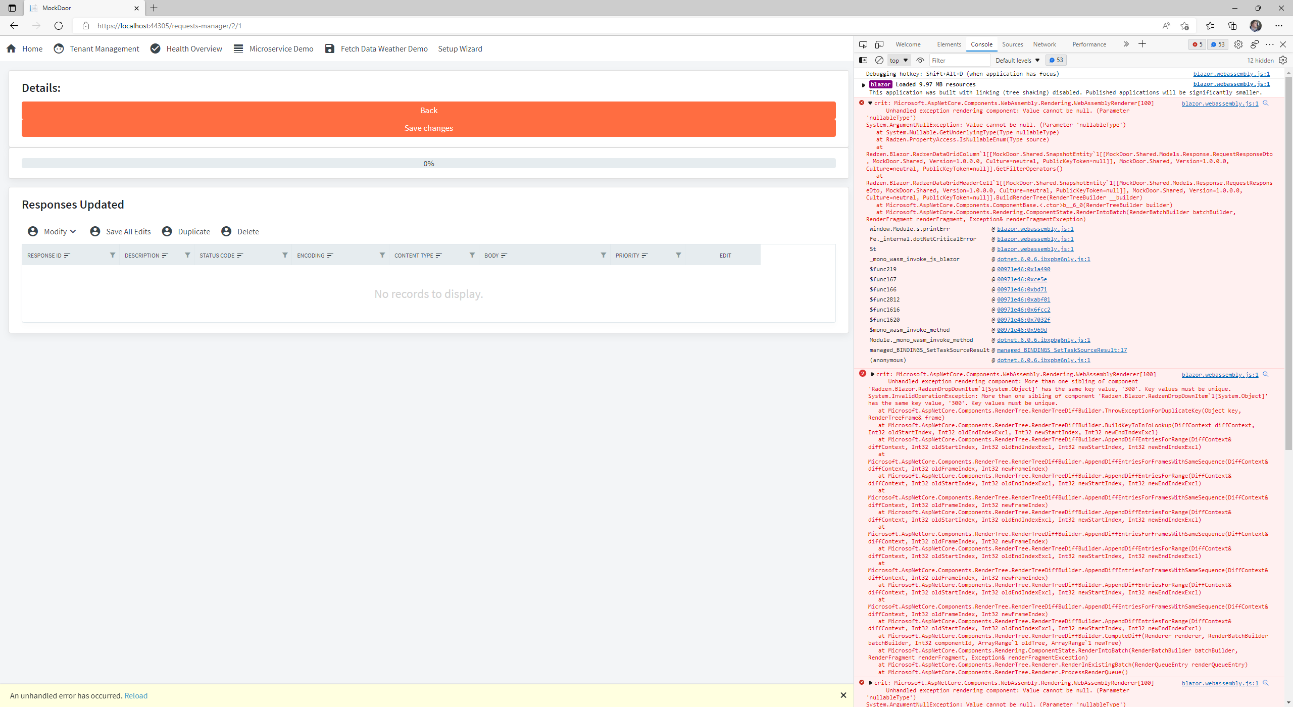 1[System.Object]' has the same key value, '300'. Key values must be unique. at Microsoft.AspNetCore.Components.RenderTree.RenderTreeDiffBuilder.ThrowExceptionForDuplicateKey(Object key, RenderTreeFrame& frame) at Microsoft.AspNetCore.Components.RenderTree.RenderTreeDiffBuilder.BuildKeyToInfoLookup(DiffContext diffContext, Int32 oldStartIndex, Int32 oldEndIndexExcl, Int32 newStartIndex, Int32 newEndIndexExcl) at Microsoft.AspNetCore.Components.RenderTree.RenderTreeDiffBuilder.AppendDiffEntriesForRange(DiffContext& diffContext, Int32 oldStartIndex, Int32 oldEndIndexExcl, Int32 newStartIndex, Int32 newEndIndexExcl) at Microsoft.AspNetCore.Components.RenderTree.RenderTreeDiffBuilder.AppendDiffEntriesForFramesWithSameSequence(DiffContext& diffContext, Int32 oldFrameIndex, Int32 newFrameIndex) at Microsoft.AspNetCore.Components.RenderTree.RenderTreeDiffBuilder.AppendDiffEntriesForRange(DiffContext& diffContext, Int32 oldStartIndex, Int32 oldEndIndexExcl, Int32 newStartIndex, Int32 newEndIndexExcl) atThe issue is the use of a RadzenDropdown to list enums that Radzen auto generates the enum filter for. Enums in C# and specifically in this case microsofts official HttpStatusCode, can and do map multiple names to the same value. This means to support enums in C# fully the dropdown also needs to support multiple options with mapping to the same value.