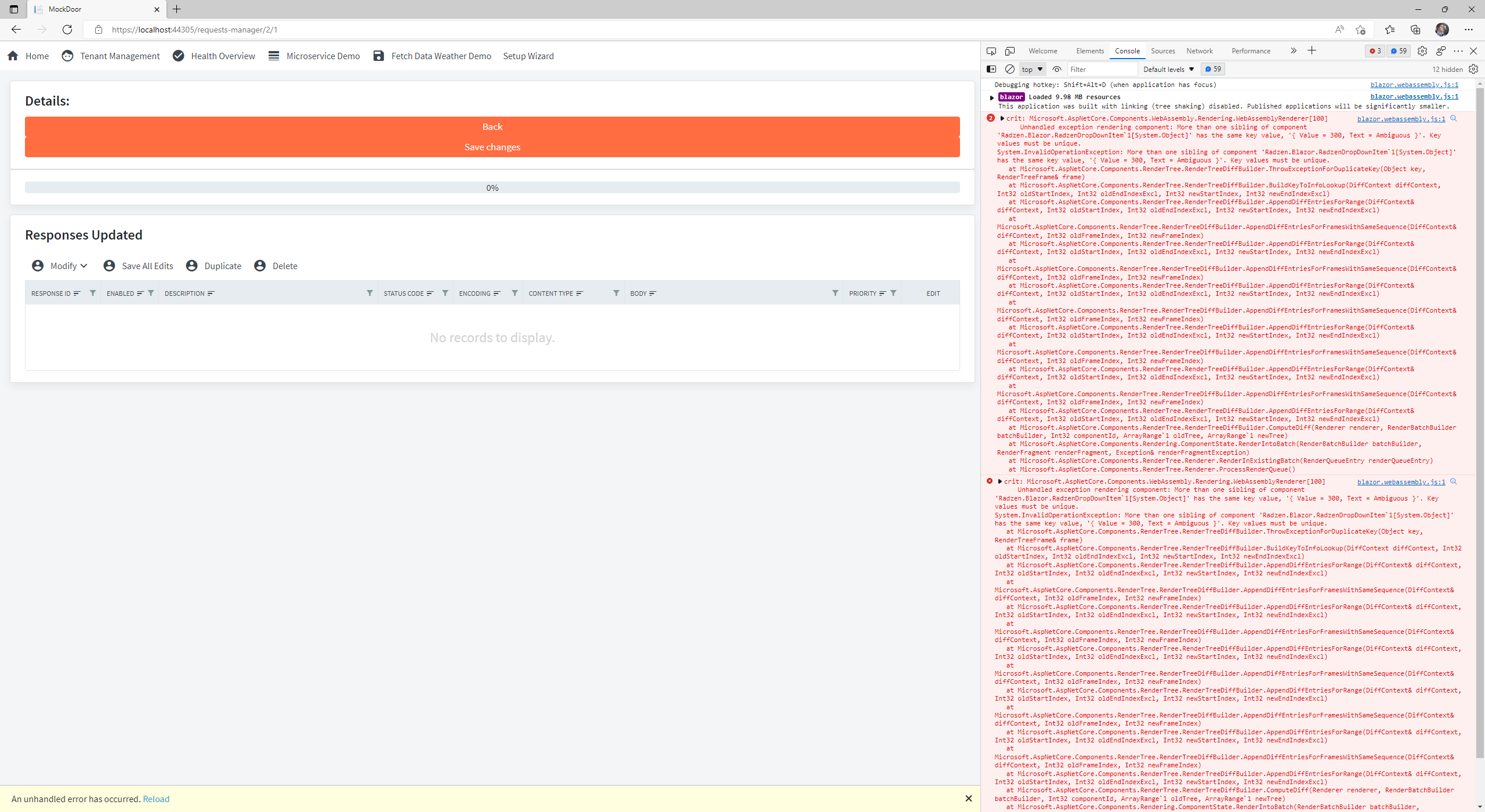 blazor.webassembly.js:1 crit: Microsoft.AspNetCore.Components.WebAssembly.Rendering.WebAssemblyRenderer[100] Unhandled exception rendering component: More than one sibling of component 'Radzen.Blazor.RadzenDropDownItem1[System.Object]' has the same key value, '300'. Key values must be unique.System.InvalidOperationException: More than one sibling of component 'Radzen.Blazor.RadzenDropDownItem