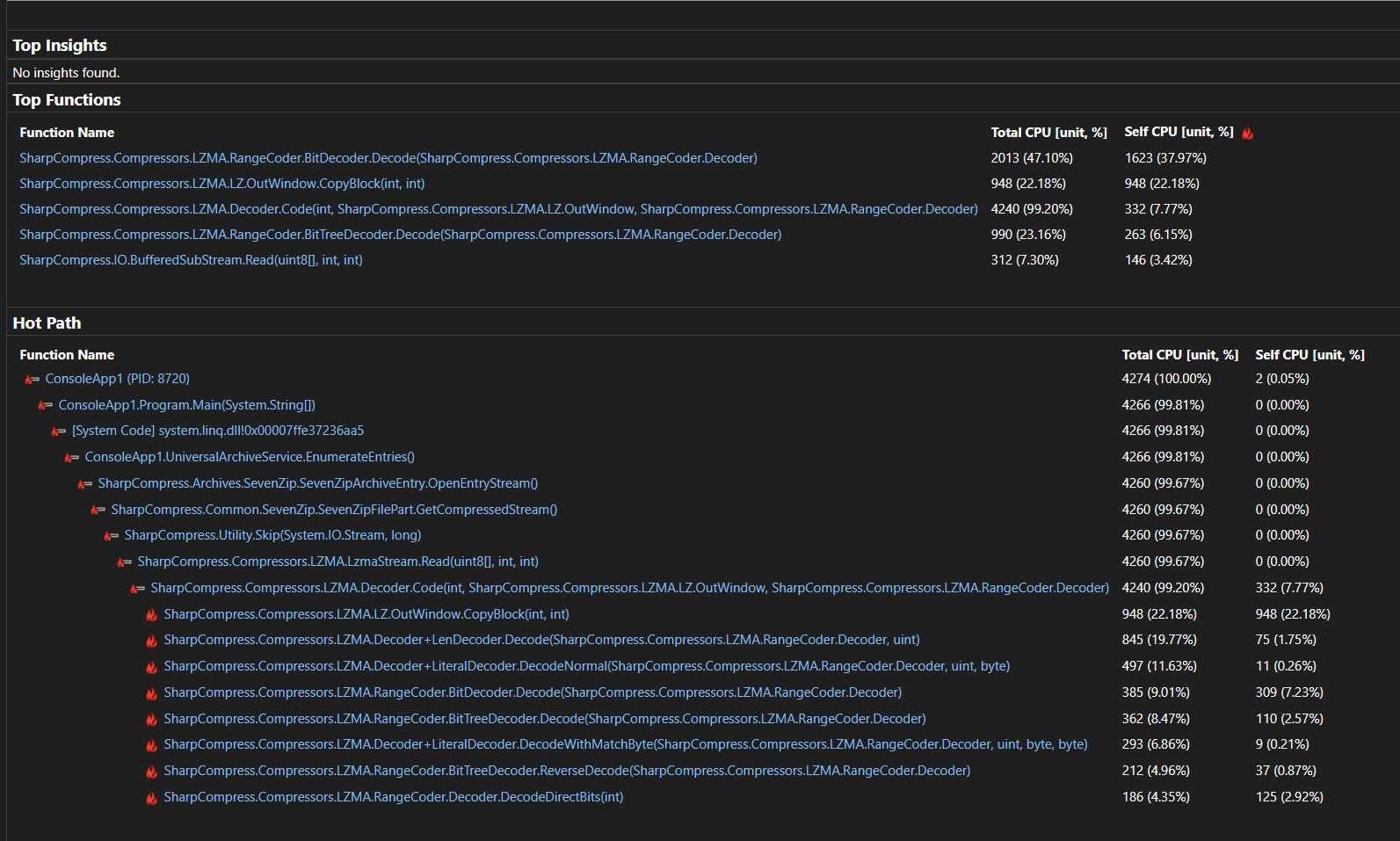 The 7zip implementation is far from optimized. I’m sure some quick wins could be from pooling byte arrays but I haven’t looked into it.
