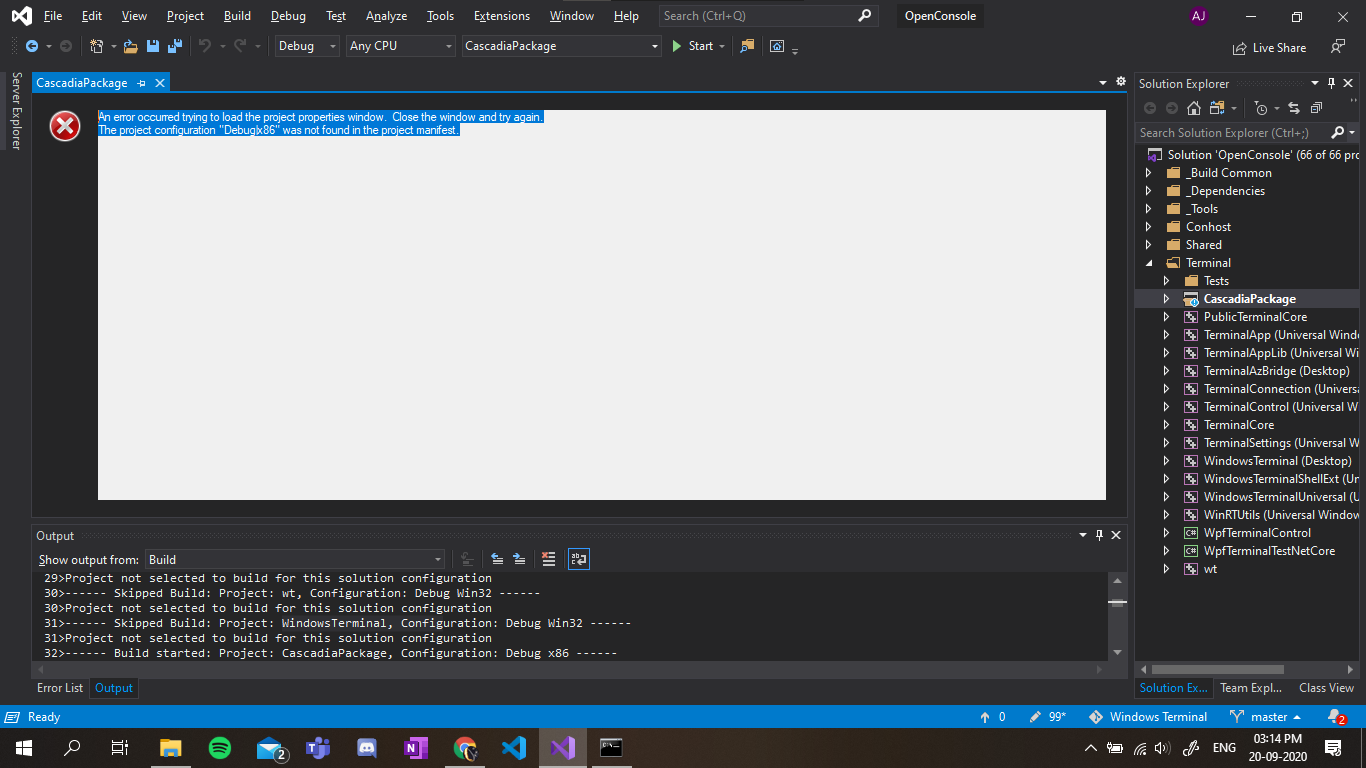 Following the debug tutorial steps in the github page for making Application process and Background proccess to 'Native Only' in the CascadiaPackage it shows this error