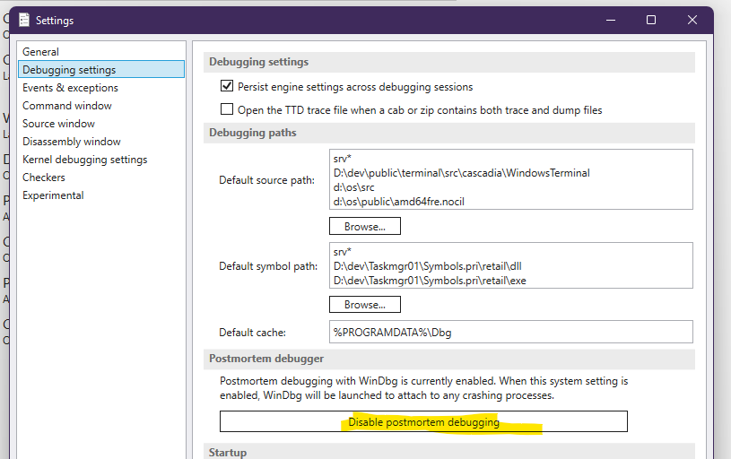 Debugger : REG_SZ : "C:\WINDOWS\system32\vsjitdebugger.exe" -p %ld -e %ldIf I do the WinDbg thing, it might get annoying if WinDbg opens up whenever anything crashes (especially if I'm doing the programming). Is that how it works? And how would I undo