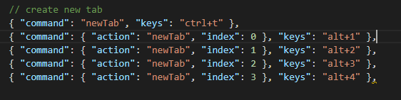 settings.jsonin your text editor and follow the instructions in the documentation (found here) to change the default bindings. In the screenshots below I have changed the bindings fromctrl+shift+1,ctrl+shift+2, etc... toalt+1.Save and then restart your Windows Terminal client and use the default hotkey (