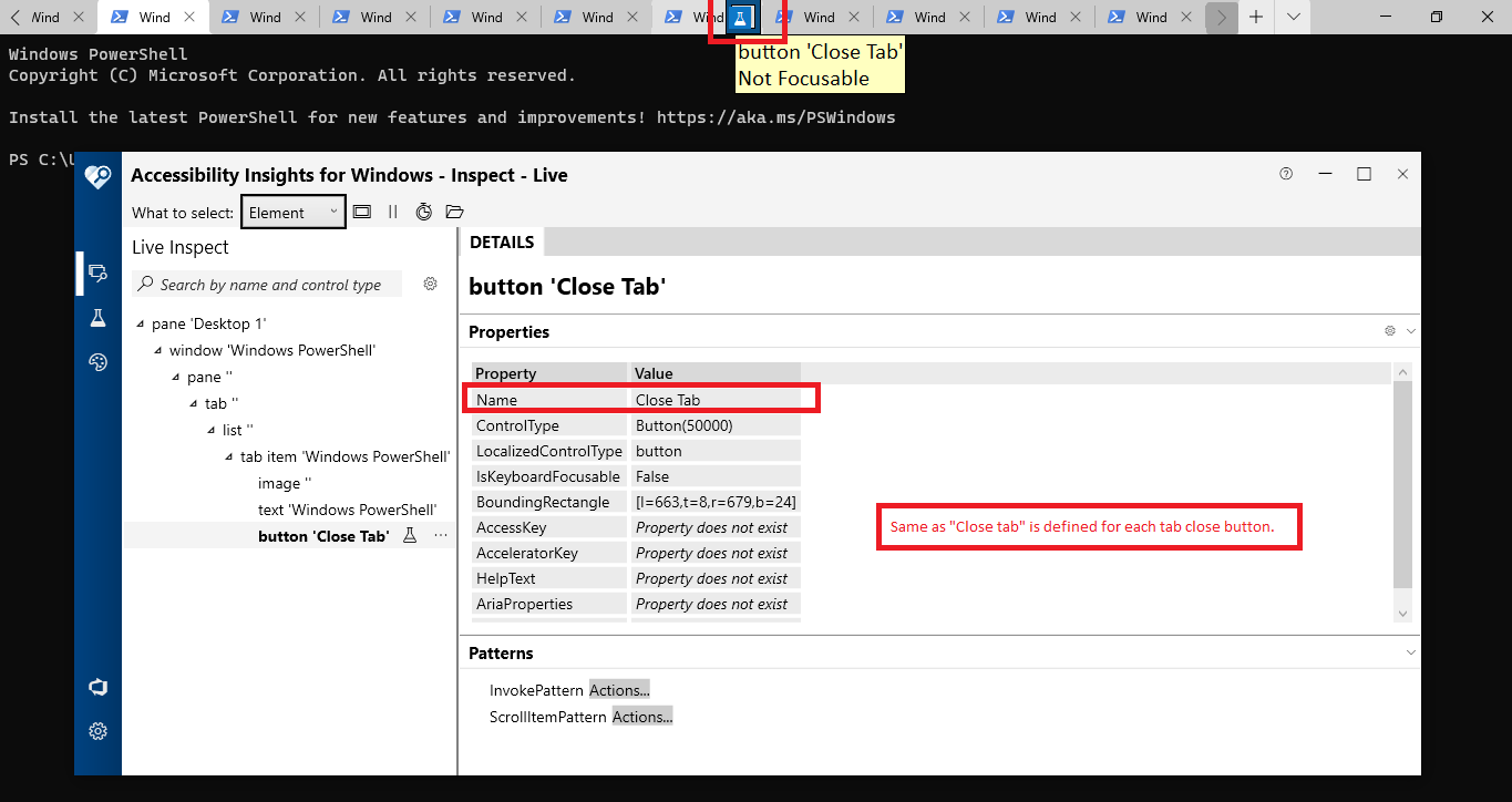 Same name as "Close Tab" is defined for all the close button present at each tab. So when screen reader focus navigates to any tab close button then narrator announces it as "Close tab button".