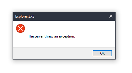 An Explorer.EXE exception popup is displayed stating: "The server threw an exception"
