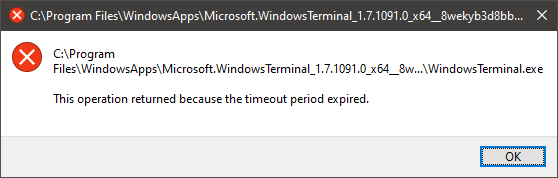 Import-Module -Name Appx -UseWindowsPowershellAdd-AppxPackage .\Microsoft.WindowsTerminal_1.7.1091.0_8wekyb3d8bbwe.msixbundleit installs fine but when I click on the Windows Terminal link on the start menu it fails to run and get this error: