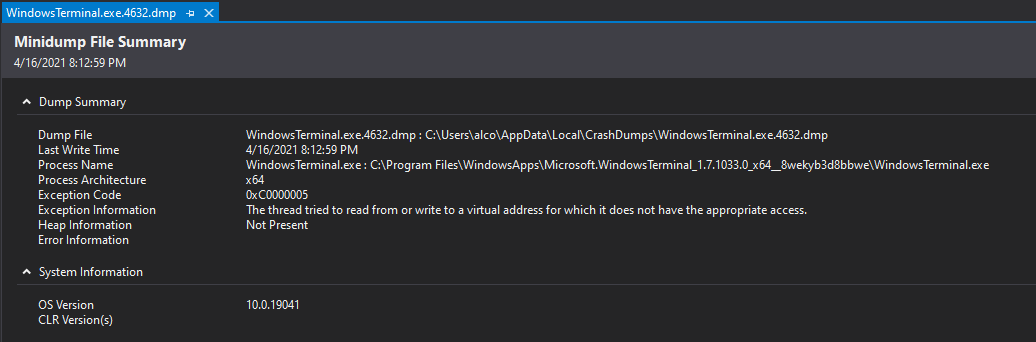 Windows terminal appears as a white window, and disappears. A dump file is created in C:\Users\alco\AppData\Local\CrashDumps