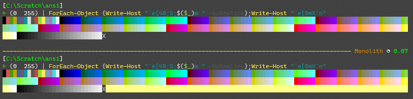 You can see the last output line does not properly reset the background and instead sets it to the background of the first character position on the line that the reset code is issued. There is an ansi reset terminal code sent just before the 'X' is displayed which works on all lines prior to the scrolling setting the background back to the default.
