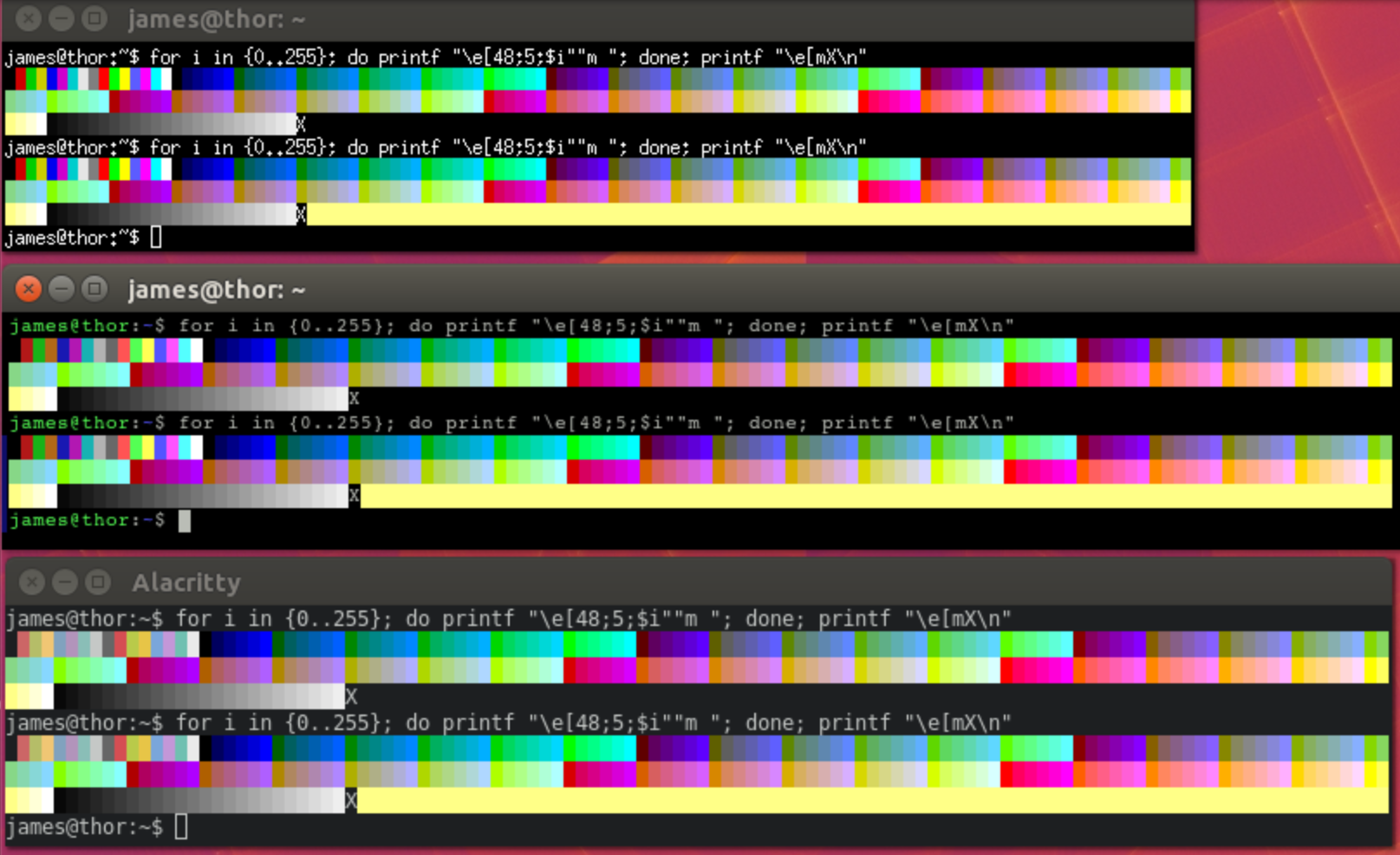 Are here are some screenshot from XTerm, Konsole, and Alacritty (I've also tested on MLTerm, Mintty, Hyper, and Contour, with the same results).