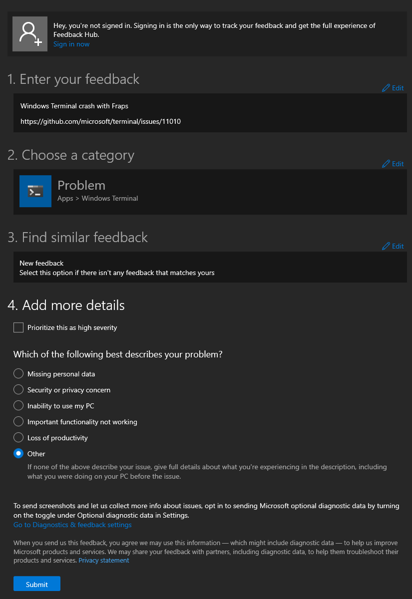 I don't see any obvious way to provide a stack trace or a dump in Feedback hub. Please do let me know if I'm missing something, but I'm not interested in sending any random unknown amounts of data from my PC to a 3rd party system and then hoping that you both 1) get what you need, 2) get nothing else.