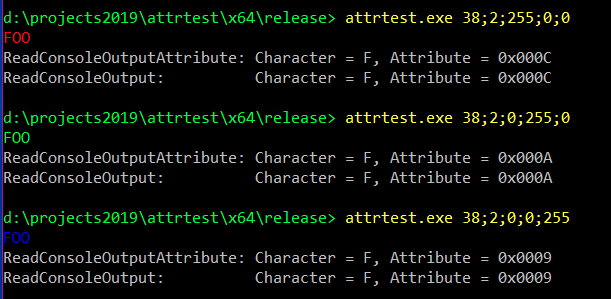 With the current general audience ConHost.exe, using ESC[28;2;r;g;bm and a color that corresponds to one of the 16 basic ones, write a character to to the console and compare the attributes given by ReadConsoleOutputAttribute and ReadConsoleOutput.