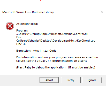 Are you running this under a debugger? If so: Are you perhaps able to screenshot or copy/paste a stack trace of the assertion failure after clicking "Retry"?