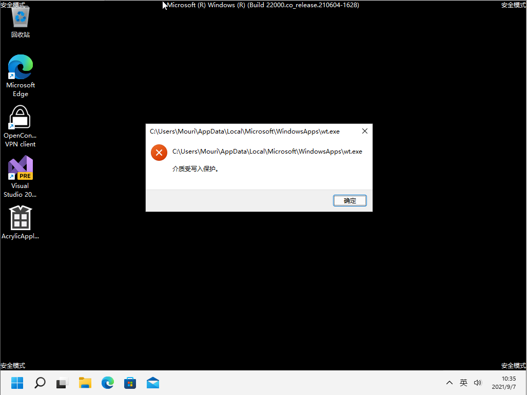 When I try to launch Windows Terminal via "wt" in the Run Dialog, it will pop up a window with the content "The media is write protected.". (I know the error message in the screenshot is Chinese, so I lookup it via the
