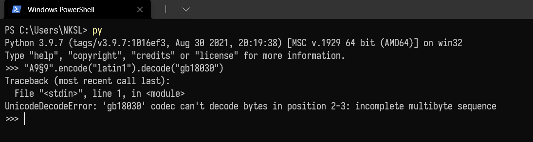 æand9which appeared in Command Prompt and Windows PowerShell. Running the Python command should outputA・(A followed by U+30FB).Actual Behavior
