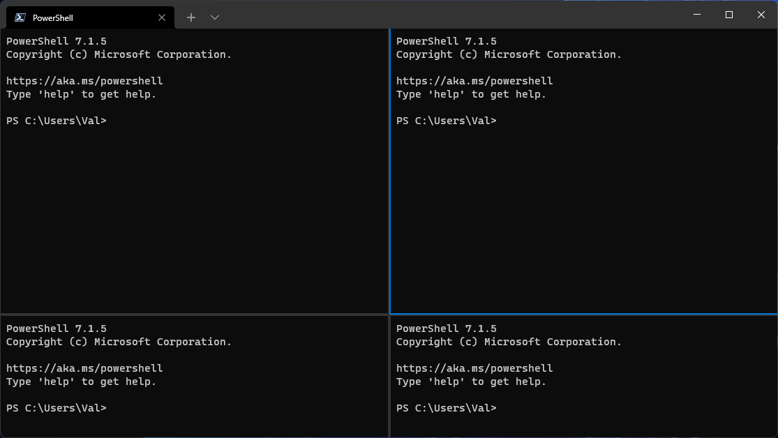 Start WT with command line arguments that split the window in 4 panes, like this: