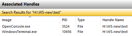 testexplorer,testdirectory. (Note that opening the terminal somewhere else, andcd'ing to thetestdirectory will not create the problematic file handles).testdirectory as a working directory.testdirectory as working directory.testdirectory. This should fail because the directory is still in use by another process.At this point, you could use e.g. Resource Monitor to see that OpenConsole.exe and WindowsTerminal.exe still have open handles on the test directory.