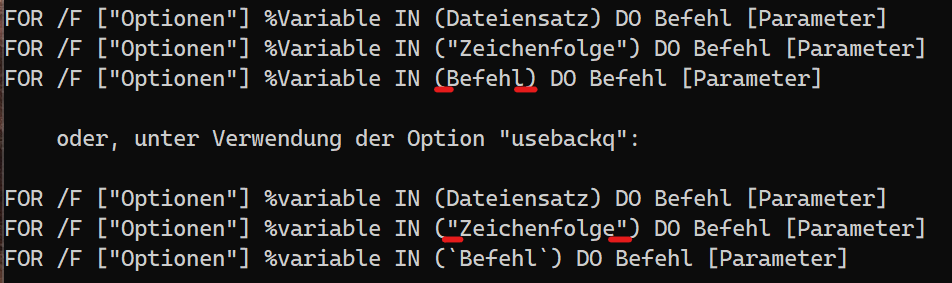 FOR /F ["Optionen"] %variable IN (Befehl) DO Befehl [Parameter]FOR /F ["Optionen"] %variable IN ("Zeichenfolge") DO Befehl [Parameter]@german-one commented on GitHub (Jan 17, 2022):