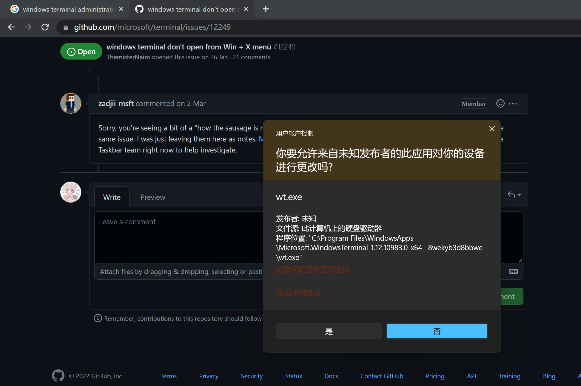 What does the UAC prompt there say is requesting to run? Presumably Windows Terminal, but what's the fill path when you click "Show More Details"? (You may need a another device to take a screenshot)