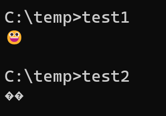 test.exe > file.txtthen file will have correct emoji symbol. So I'm pretty sure Windows Terminal should support that too.Steps to reproduce