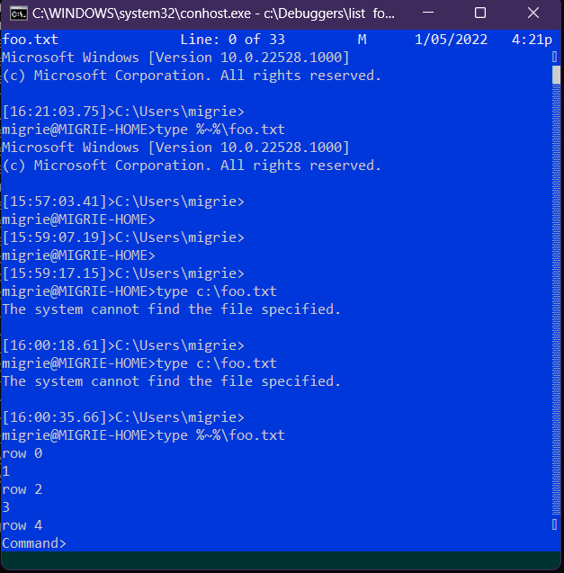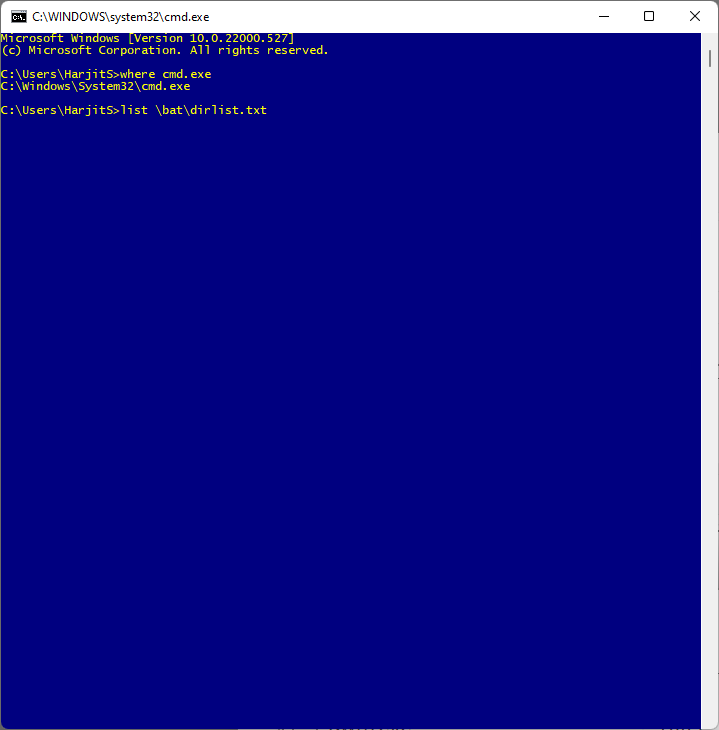 Then in the cmd window ran the command: list c:\bat\dirlist.txt