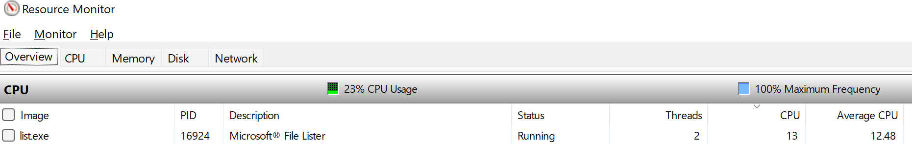 As previously mentioned that after some time, I see an entry in Resource Manager that takes a full core. So, I connected WinDbg to that and the session is also attached: ListExe.txt
