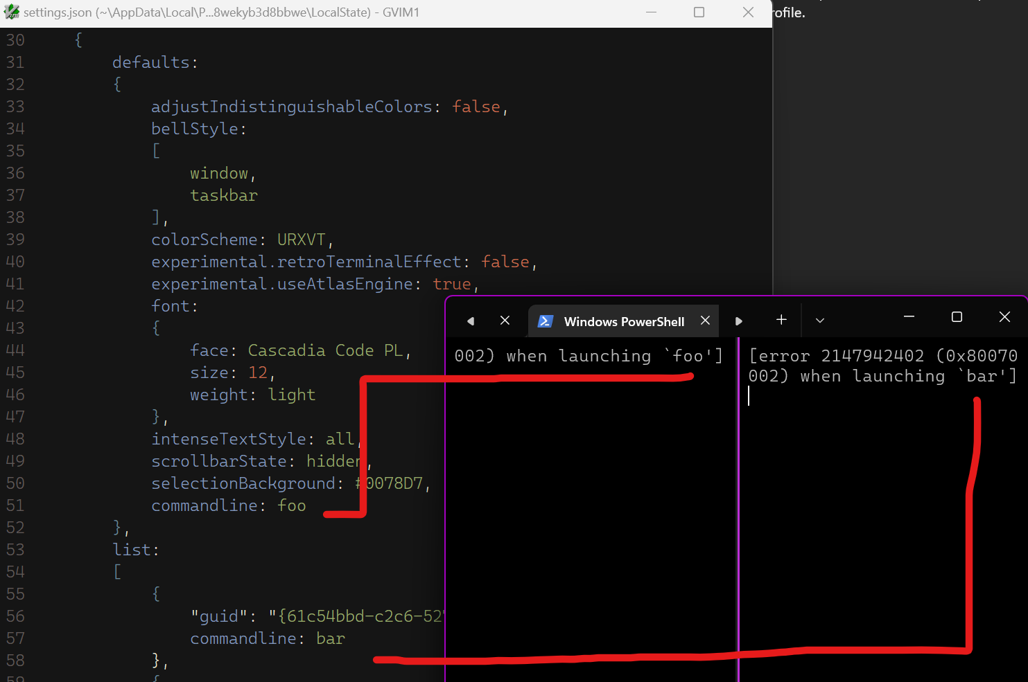 This profile definition will use pwsh.exe for both profiles, but if you switch to the commented-out commandline values, it will work.