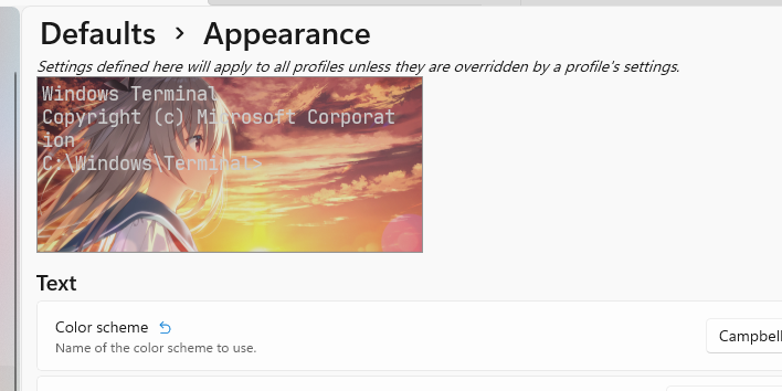 null background imageprop ("backgroundImage": null,) which cause default cannot cover this empty configuration.Windows Terminal should delete this prop instead of simply assign it to null