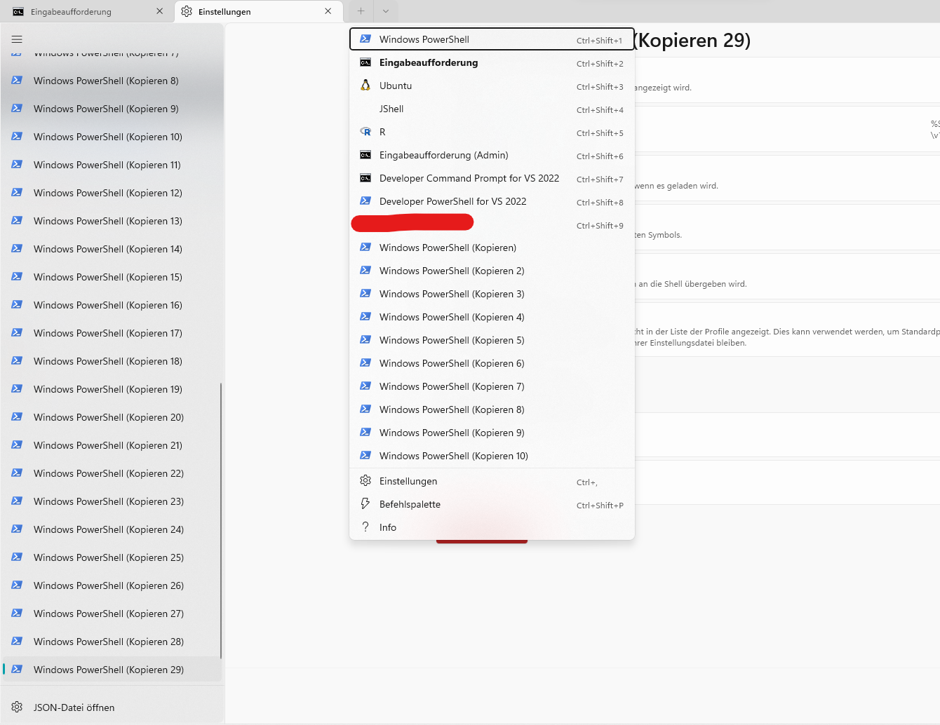 The profile list should be scrollable. There is no way to create sessions from profiles later in the list except by assigning key combinations in the settings.