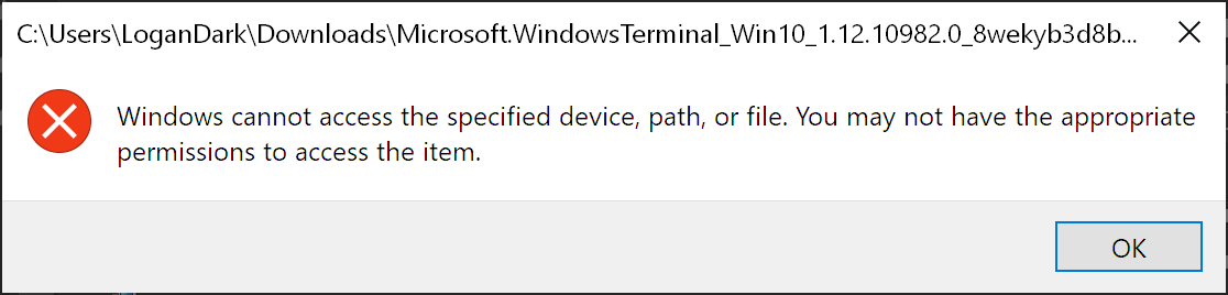 downloadsfolder.If doing the ACL change fixed your other application problems, can you launch Settings, Apps/Features, Terminal, More, and click Repair?