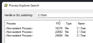 procmon.exereported handles by non-existing processes. I believe that happened when I closed the WindowsTerminal, that I initially opened, but still had a different Terminal open at a different location.Only after closing the Terminal that was opened, the handle is released and the folder can be deleted.