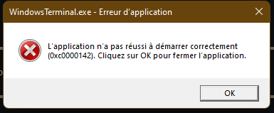 0xc0000142error dialog? That might enlighten as to which process in this whole setup is actually the one that's failing to start.Does launching the Terminal elevated via the taskbar