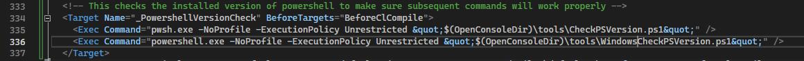 $PSVersionTable, or$PSVersionTable.PSVersion.Majorto be more specific), the name of the .exe file is different between Windows and Core. For Windows PowerShell, it is powershell.exe as opposed to pwsh.exe for Core. Here's what I propose as a solution, that I have implemented in the .vcxproj file:What this does is it calls scripts I wrote that check the version of PowerShell installed. For pwsh.exe (PowerShell Core), if the version installed is less than 7.0.0, it writes an error and exits. But, for powershell.exe (Windows Powershell), it only checks to see if it is installed. If it is installed, it writes an error directing the user to install PowerShell Core, but will not exit, in case the user has both Core and Windows installed. Here are the exact scripts: