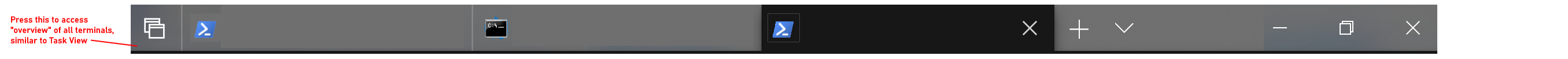 Would be nice with a "zoom" button that zooms out all open terminals (like using Task View in the taskbar) and presents thumbnails. That way you can get to the window you want faster, since there is no way of telling any two terminals apart in the tabs.