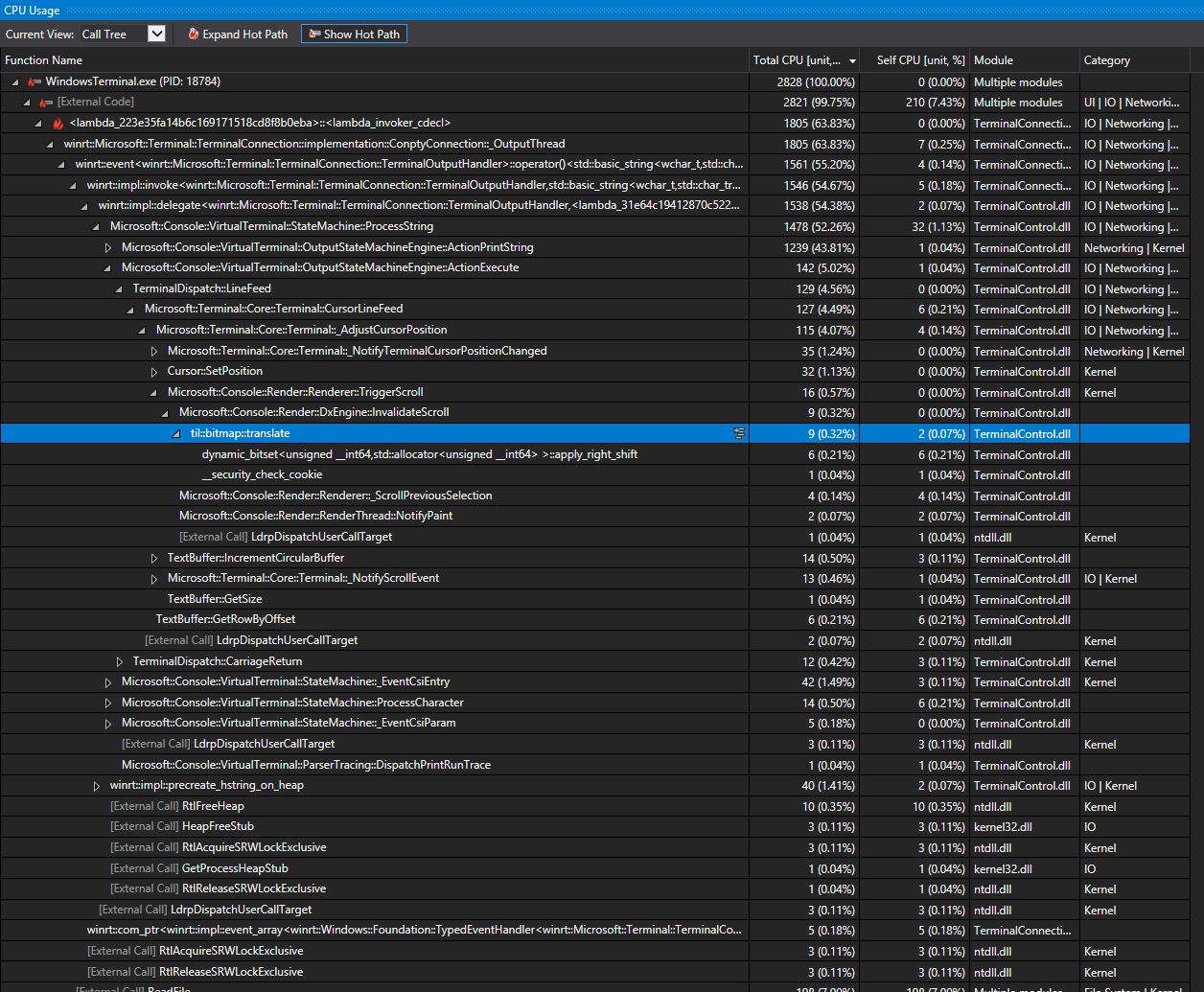 til::bitmap::translate: use bit shifts when the delta is vertical.Performance while printing the content of a big file, with the patch from #6492 which hasn't been merged yet, in Release mode: