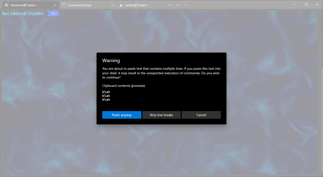 SecondaryButtonTextproperty on theMultiLinePasteDialogvia theResources.reswfile. Adds a condition inTerminalPage::_PasteFromClipboardHandlerto check if the secondary button was pressed and to replace line breaks in the text with spaces, if so.C++ newbie, feedback welcome.