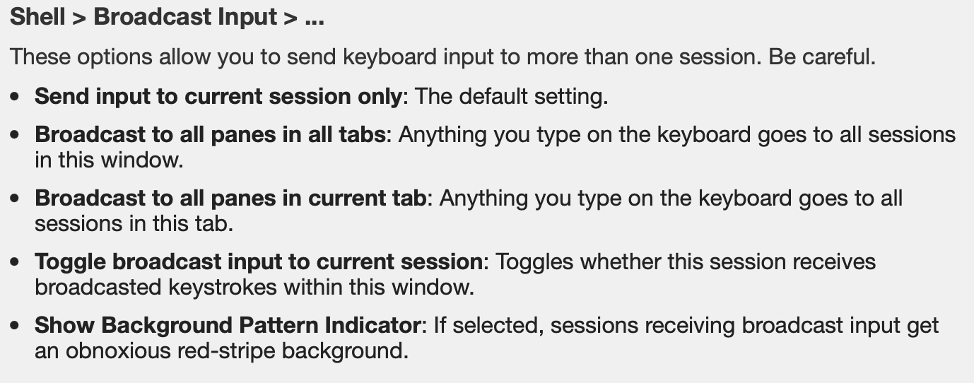 On my mac I have a program I wrote that greps systems out of the /etc/hosts, then one by one opens them in tabs in iterm. So, with one command I can open all 20 prod systems. Then I can broadcast the input to all 20 systems to perform the task at hand. The first thing I look for in a terminal app is if it can do tabs. Then can I script the opening of those tabs. Then can I broadcast the input to those tabs. Iterm2 is really the reason I run a mac. Apple should be paying these guys. If Iterm ran on windows, I'd probably switch over to windows. I mean on my mac outlook, teams, word, powerpoint, excel, onenote, edge, vsCode, iterm are the programs I use most so if Windows had an iterm replacement why run a mac?