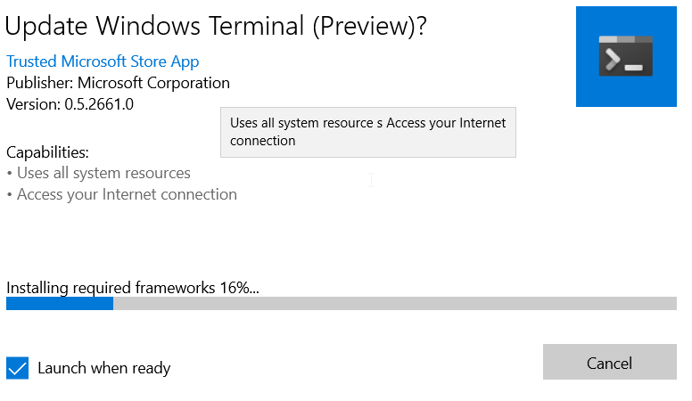 In https://github.com/microsoft/terminal/issues/2647 I reported that the Github preview asset 0.4 hung when installing behind a company proxy server. This was fixed by manually installing dependency package: VCLibs.140.
