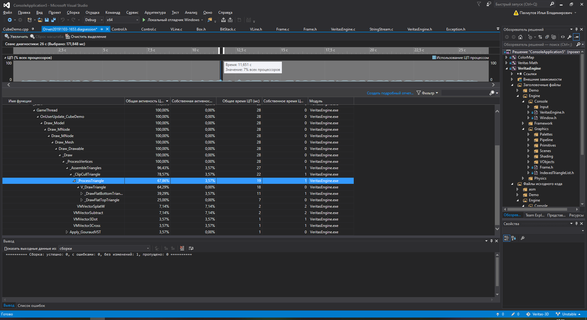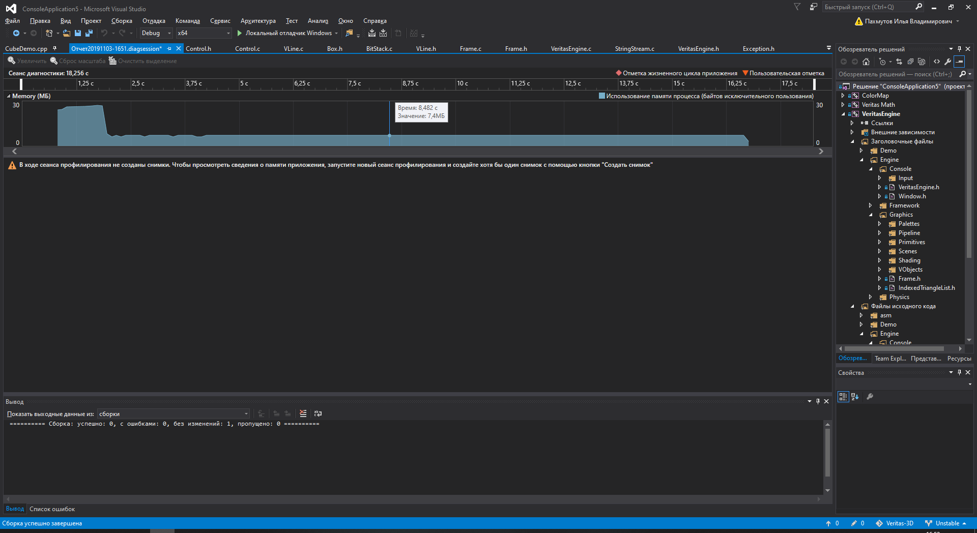 I have my diag tools broken in VS15 for no reason, but the launchable tests show the average mem usage is about 7.6 Mb, including all the assets loaded (nanosuite, textures to it), all the buffers allocated and classes. Processor usage is about 7%, most of it is taken by drawing triangles.