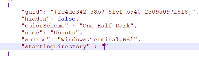 \\wsl$\prefix. For any WSL distro who's name isDistroName, you can use\\wsl$\DistroNameas a Windows path that points to the root of that distro's filesystem.For example, the following works as a profile to launch the "Ubuntu-18.04" distro in it's root: