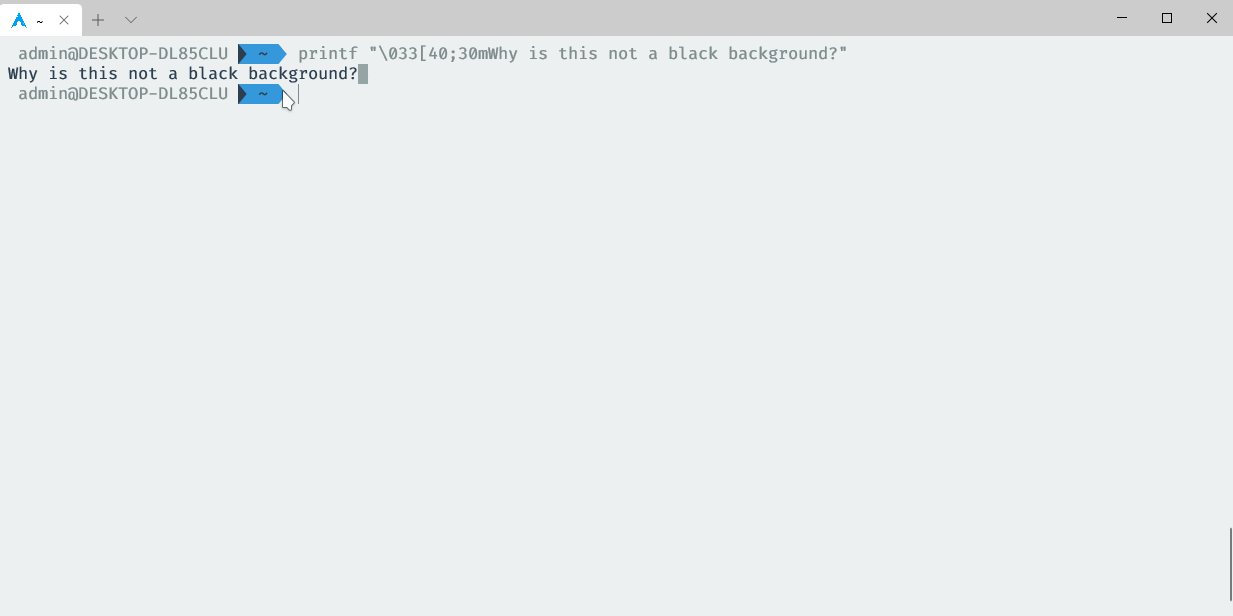 printf "\033[40;30mNot a black background"on WSL aswell ascolor 0fon cmd.Expected behavior