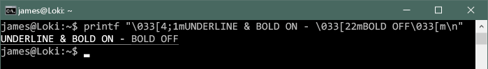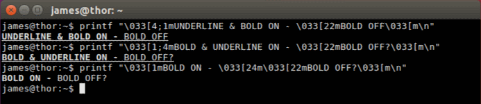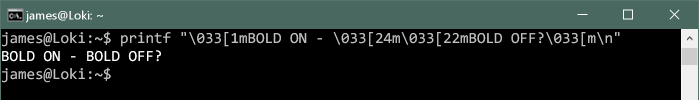 \033[22mis supposed to disable the bold attribute, but sometimes it doesn't have any effect. It seems to depend on what other attributes have been enabled beforehand, and the order in which they've been applied.For example, consider the sequence below, which enables the underline and bold attributes, then disables the bold attribute. This works as expected, leaving only the underline attribute enabled.