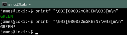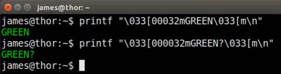 The point of the test was to determine whether leading zeros were supported in parameter values. And while the Windows console does handle them some of the time, it fails when the parameter value is more than 5 digits long. For example, consider these two sequences for setting the text color to green: