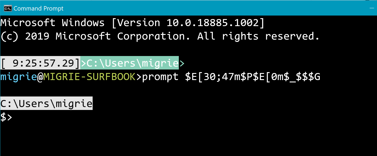 SET PROMPT=$e[37;1;42m$T$S$P$_$G$e[37;0;40m