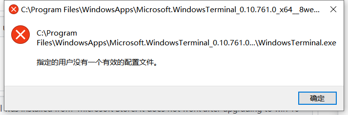 The windows terminal was installed from Microsoft Store. It does not work after upgrading to win 10 1909(build 18363.720). I try to reinstall Terminal with release version 'Preview v0.10.761.0', doesn't work neither. The error in the picture said "The specified user does not have a valid configuration file"